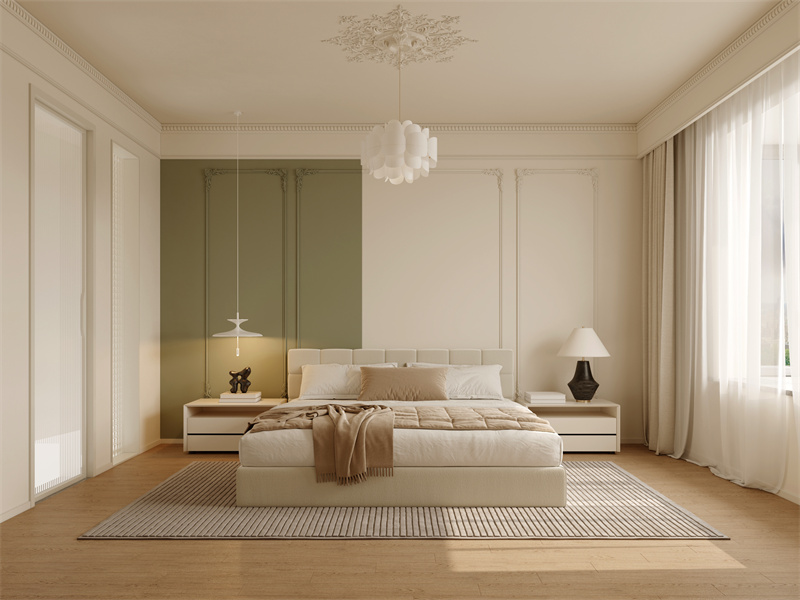 雕花吊顶、双色调背景墙打破单调,注入现代感。低饱和床品、线性光营造松弛氛围,用经典元素简化搭配实用功能,构建兼具仪式感与舒适感的睡眠私域。