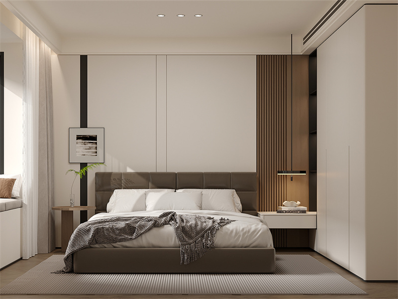 以简洁的线条与中性色调为主,营造出简约舒适的氛围。皮质床头与木质元素搭配,增添质感与层次感,侧边收纳与灯光设计,提升了空间的实用性与温馨感。