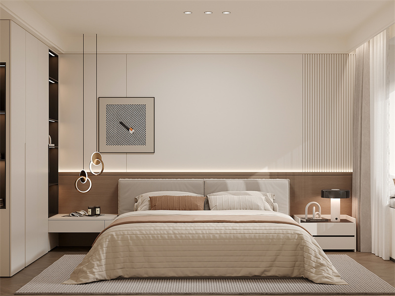 采用柔和的米色调,营造出宁静温馨的休憩氛围。简洁的床头设计搭配线性灯光,增强空间层次感,嵌入式收纳与个性吊灯结合,既满足实用需求,又增添了设计感。