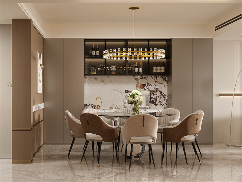 运用暖棕色调与大理石元素,营造出雅致的用餐氛围。水晶吊灯成为视觉焦点,提升空间奢华感,餐边柜设计兼具收纳与展示功能尽显精致格调。