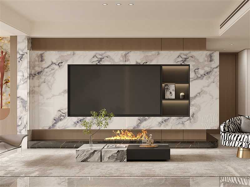 以大理石元素为主打造电视背景墙,纹理自然且富有时尚感,搭配嵌入式壁炉设计,提升空间层次感与温馨氛围。整体营造出轻奢大气且舒适的生活居所。