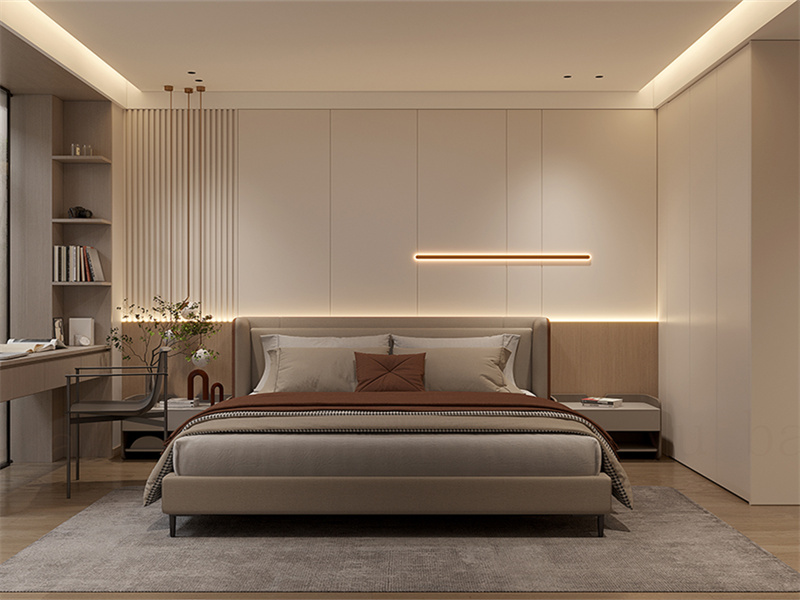 以浅色调为主,营造出静谧舒适的休憩氛围。简洁的床具搭配柔和灯光,提升了睡眠环境的舒适度,嵌入式收纳与书桌一体化设计,满足了收纳与办公的双重需求,自然光线与无主灯结合,让卧室更显温馨。