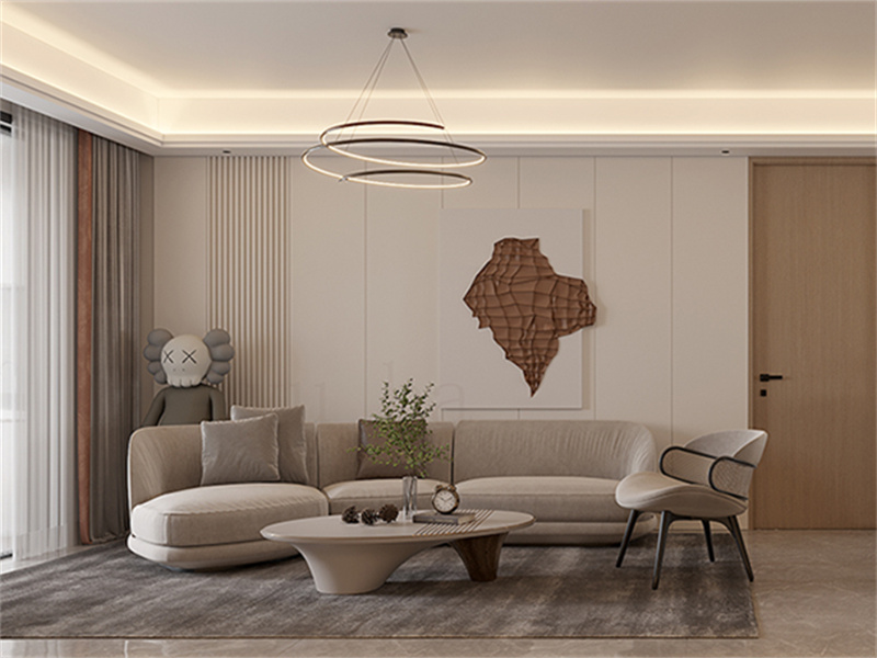 整体风格简约舒适,弧形沙发柔软大气,搭配造型独特的茶几,打造出放松的会客场景。创意吊灯与艺术装置画提升了空间的设计感,玩偶摆件增添了生活趣味,营造出温馨雅致。
