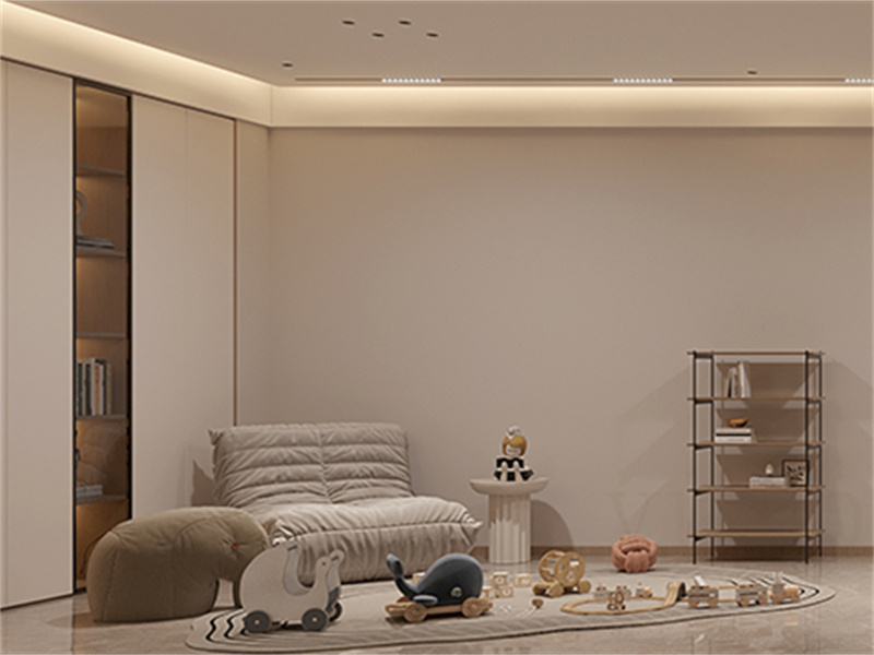 以柔和的浅色调为主,营造出温馨且安全的儿童活动氛围。舒适的休闲沙发为家长陪伴提供便利,各式木质与布艺玩具散落,充满童趣。打造出一个集玩乐与收纳于一体的实用空间。