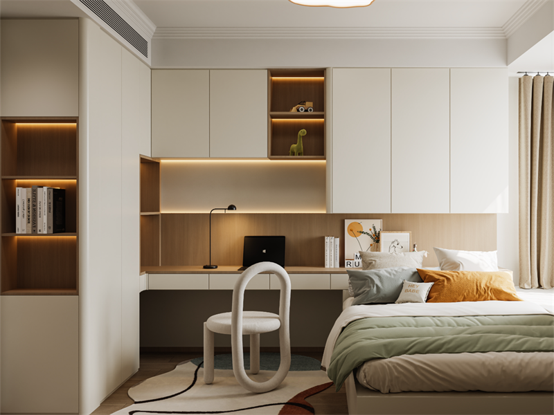 融合了休憩与学习功能,柜体与书桌一体化设计,充分利用空间,满足收纳与办公需求。柔和的灯光与色彩,营造出温馨的氛围,打造出实用功能卧室。