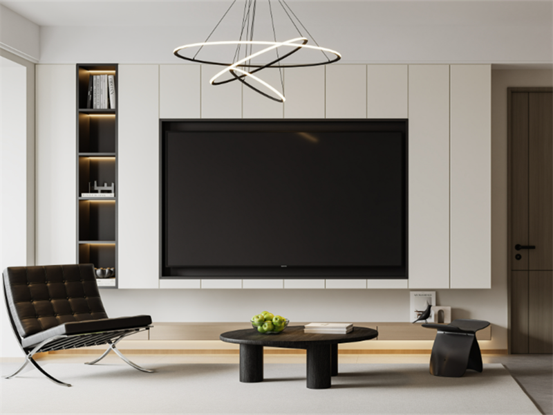 整体风格简约大气,大面积的柜体设计与电视结合,兼具收纳与展示功能,搭配个性单椅,满足会客需求。创意的灯光设计,提升了空间的氛围感。