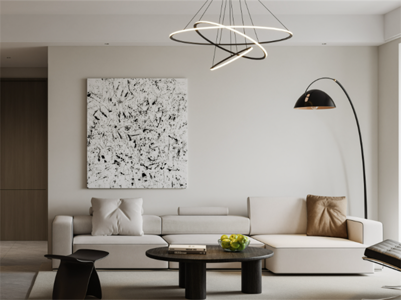 以浅色调为基底,搭配简约的家具造型,营造出干净利落的氛围。黑白抽象画增添艺术气息,沙发与茶几的搭配舒适实用,落地灯为角落提供了局部照明。