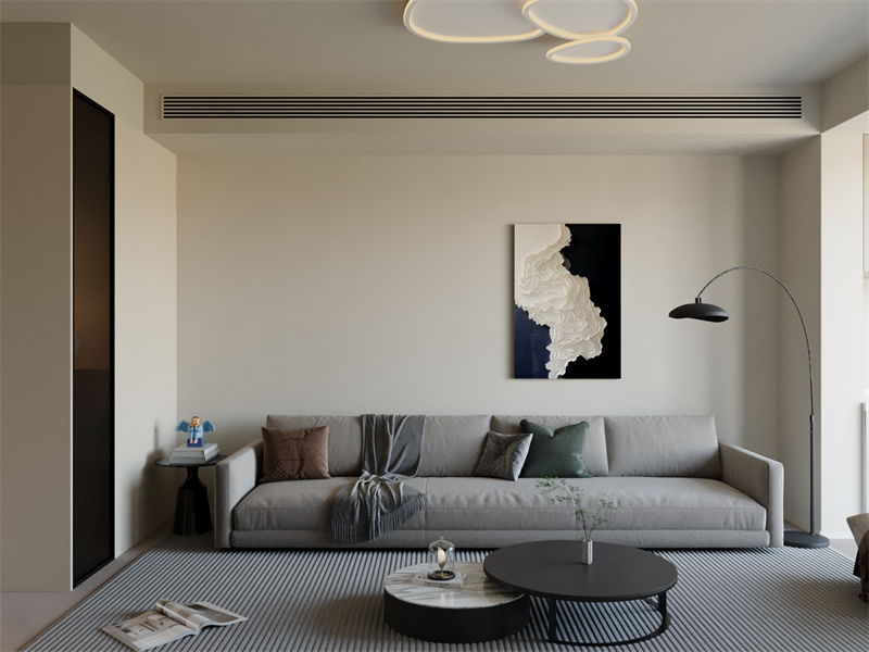 以柔和浅棕为基调,浅灰沙发搭配多色抱枕,丰富层次,圆形与异形茶几组合,强化现代感。艺术挂画、落地灯与条纹地毯,让空间在简约中尽显雅致,打破空间单调。