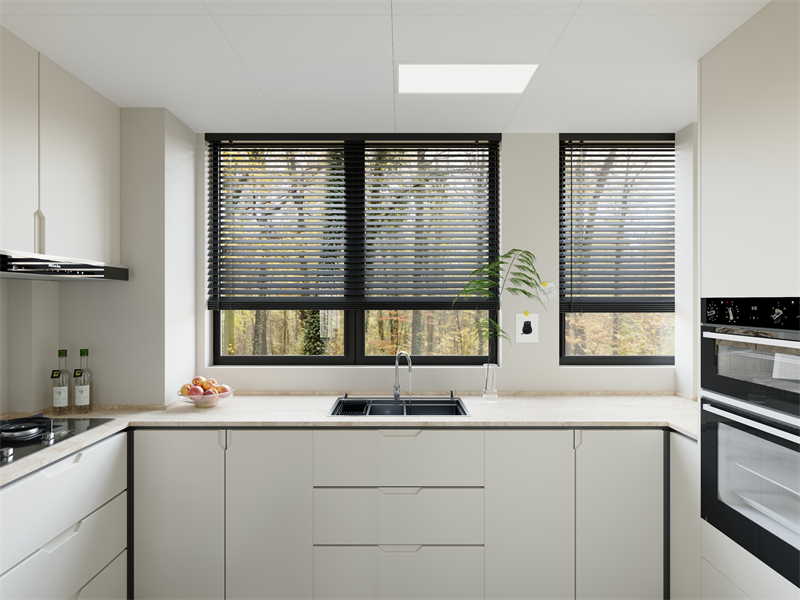 浅白柜体搭配深色窗框、百叶帘,形成色彩对比。U型布局合理规划操作动线,嵌入式厨电与整洁台面提升空间利用率,既保证采光又具隐私性。