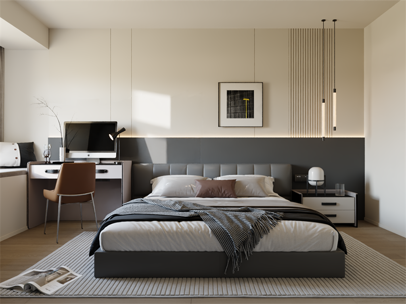 深灰床头墙与浅棕背景形成层次,悬浮灯、线性光营造静谧氛围。一体化书桌床具,满足卧室办公需求,撞色床品与艺术挂画,为空间注入活力,在实用与美学间达成平衡。