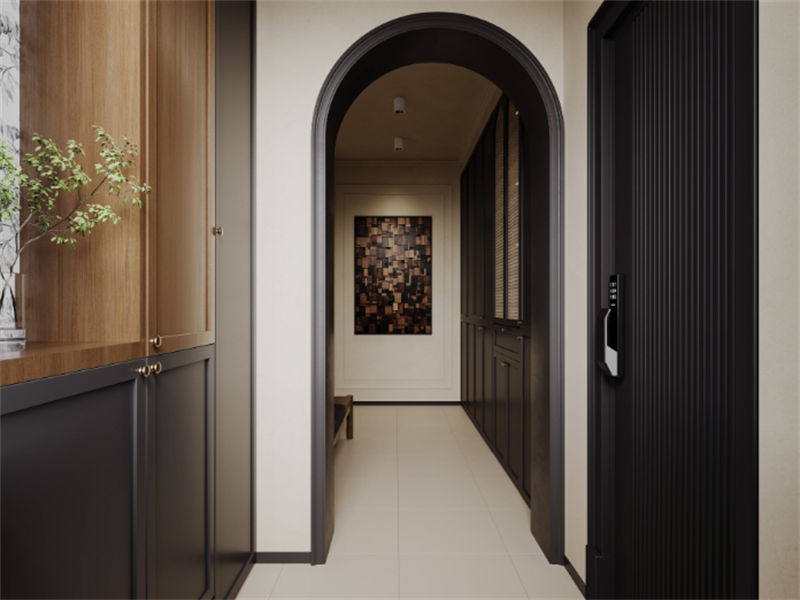 采用复古与现代结合的设计,拱形门洞提供仪式感,深棕与木色柜体搭配,兼具收纳与装饰功能。墙面艺术画增添艺术气息,打造出富有层次感的入户体验。