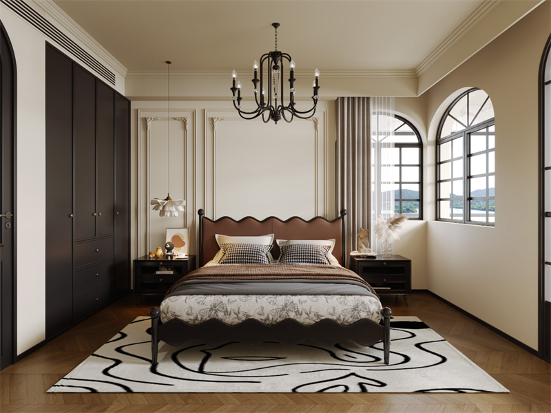 卧室走复古轻奢风,雕花床头与黑色吊灯尽显典雅,拱形窗设计呼应整体风格,深色柜体提供充足收纳。床品与地毯的搭配,在复古中透出温馨。