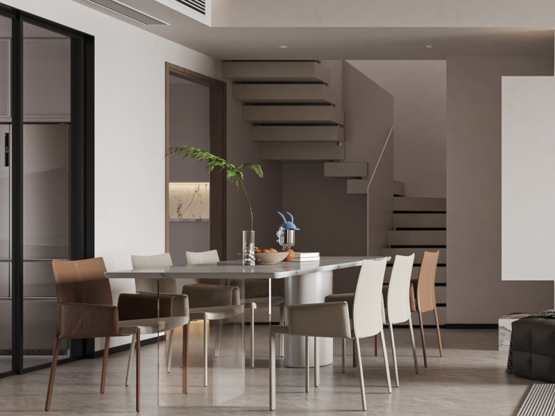 浅灰餐桌似云间台,撞色餐椅如跳跃的光斑,绿植在瓶中舒展成自然的注脚。楼梯线条利落如琴键,玻璃隔断让空间透气又通透,在这里用餐,是味觉与视觉的双重留白,把 “烟火气” 酿成了生活的散文诗。