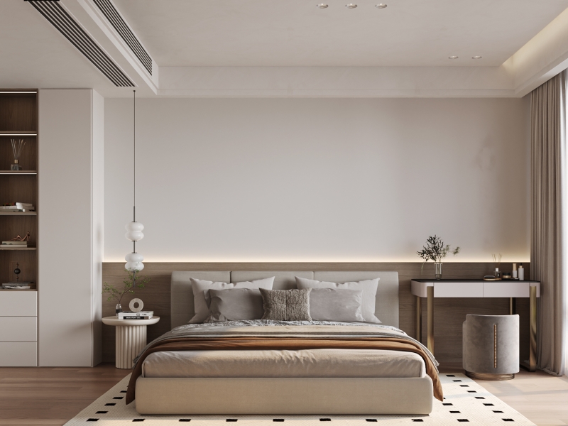 奶白床品裹着温柔,浅棕肌理晕开暖意,吊灯似云朵坠在枕边。灯带勾勒出静谧的轮廓,梳妆台藏起琐碎,脚踩黑白格地毯,像踩进了松弛的韵律里,这里是卸下所有铠甲,与自己温柔对视的私域。