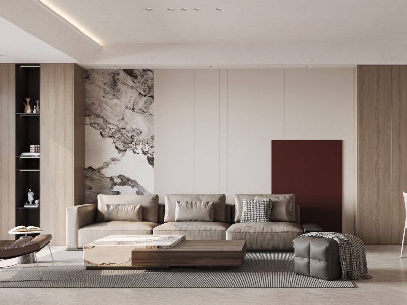 浅棕沙发如被阳光吻过的软绒,墨色石纹墙似泼墨画卷,一抹酒红是藏在空间里的惊鸿。木质肌理与金属线条轻碰,光影裹着质感漫开,窝在这里,连发呆都像在艺术展里偷闲,适配都市人 “松弛又精致” 的生活节奏。