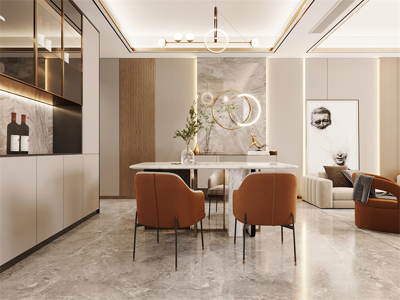 柔和色系与质感材质衔连出静奢氛围,线条的轻缓与细节的精致相衬,让餐区在雅致里透着松弛。软装的轻量点缀,平衡了空间的柔与力,既显格调又裹着舒适的温度。