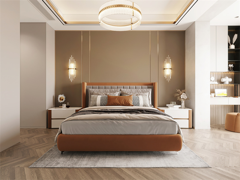 以温润色调为基底,柔质与精致线条交织出雅致氛围。细节处的金属点缀,让克制的布局里浸着轻奢质感,在舒适里平衡了美学与温度的分寸,营造出松弛又不失格调的睡眠环境。